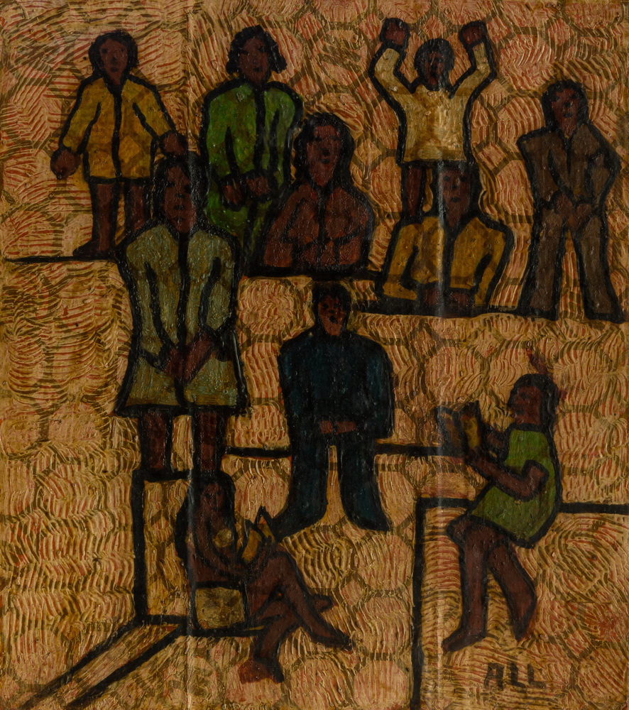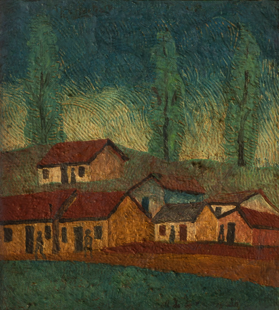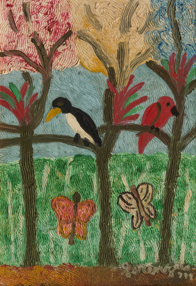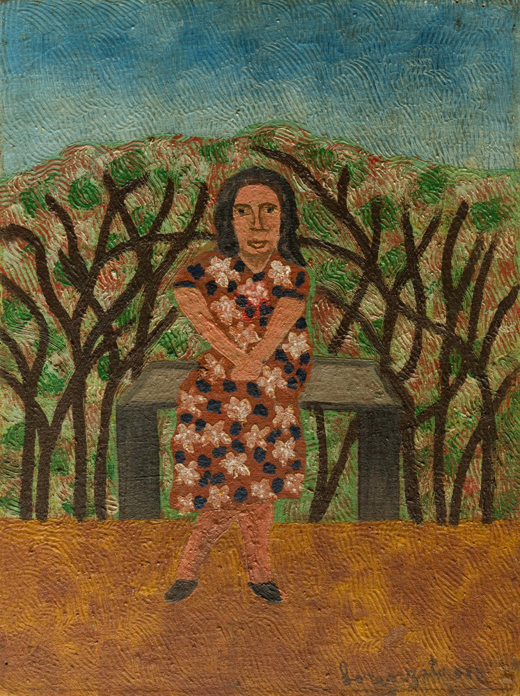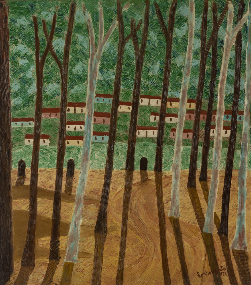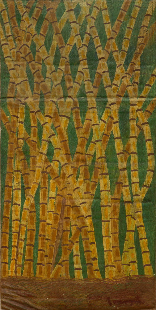 E o que dizer desses troncos de árvores, bambuzais, renques verdes, entrelaçamentos súbitos, urdiduras complexas, que nada têm a ver com a observação da natureza? Há também as pessoas, os boizinhos, todos de caras indefiníveis, coisas que não se dão a ver; e o jogo das cores fazendo nosso olhar brincar de amarelinha, cores, como tudo o mais, baças, sem brilho, obrigando-nos a chegar perto, atraindo nossa atenção para a superfície espessa, convidando-nos a habitá-las.