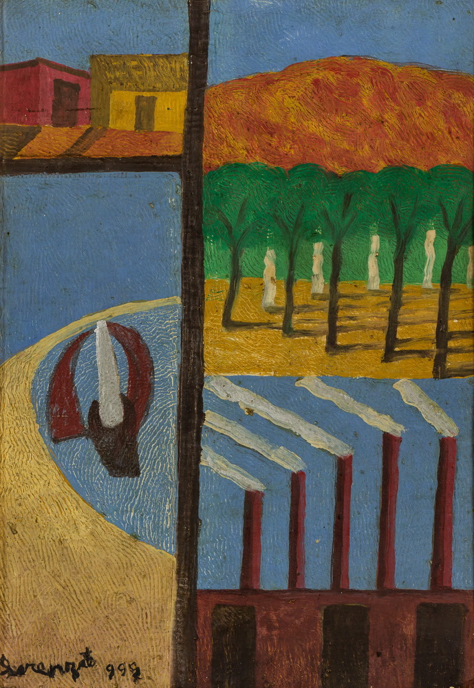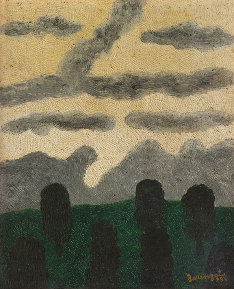 A poética de Lorenzato, como é característico entre os grandes artistas, é singular. Não se filia a nenhum movimento, a nenhuma igrejinha, embora dialogue à distância com muita gente. Mas tente enumerar os artistas que inventaram mundos. São poucos. E o de Lorenzato é muito particular. Percorra as muitas paisagens trazidas para esta exposição. Perceba os céus, especialmente as nuvens, ah, as nuvens de Lorenzato, densas, variando em formatos estranhos.